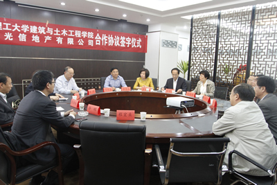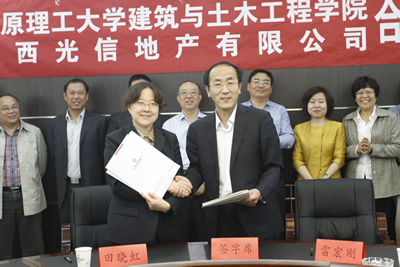 建工公司经理雷宏刚与山西光信地产有限公司副总经理田晓虹分别代表院企双方签订《建工公司与山西光信地产有限公司合作协议》。双方还就建立老员工实习基地、产学研结合等方面的问题进行了深入探讨。