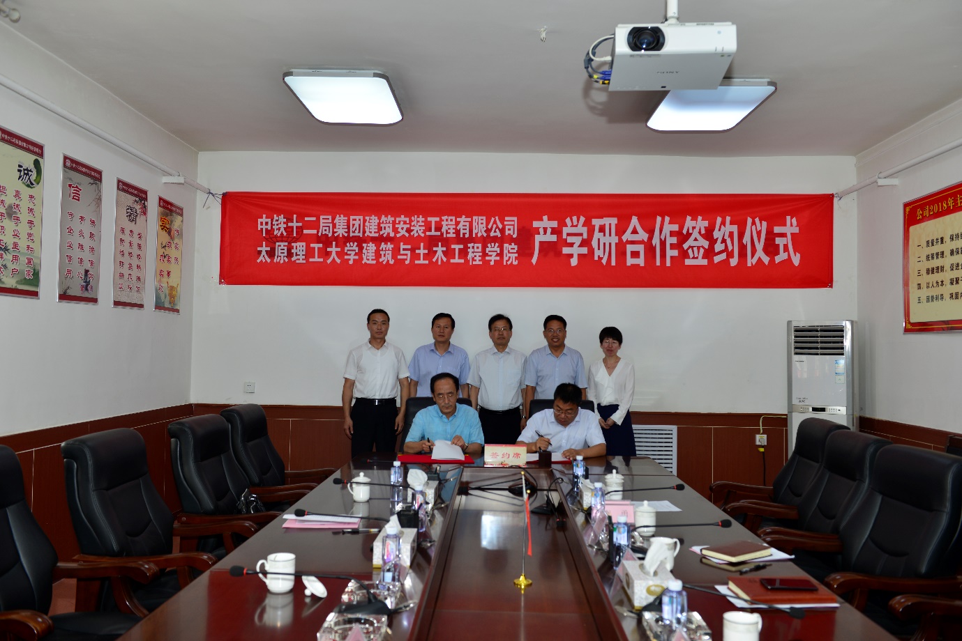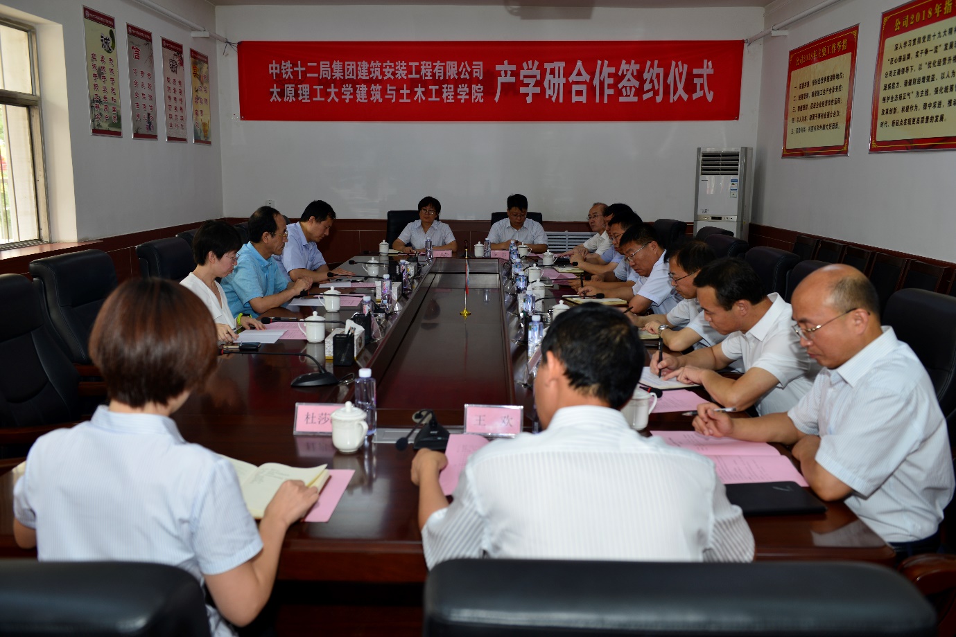 2018年7月8日上午10点,bg大游建筑与bg大游集团官方网站与中铁十二局集团建筑安装工程有限公司在建安公司会议室举行产学研合作框架协议签署仪式及产学研合作揭牌仪式。建筑与土木工工程公司经理雷宏刚教授、土木系主任董晓强教授、土木实验中心主任刘元珍教授,中铁十二局集团建筑安装工程有限公司董事长、总经理蔡英康、党委书记姜振生、公司副总经理、总工程师王中军、副总经理卢会永、副总工盖宏、副总工解明旭、副总经济师李勇、科技部副部长范伟、科技部副部长王美静、测试中心副主任王欢、科技部部员杜莎莎出席了签约及揭牌仪式。