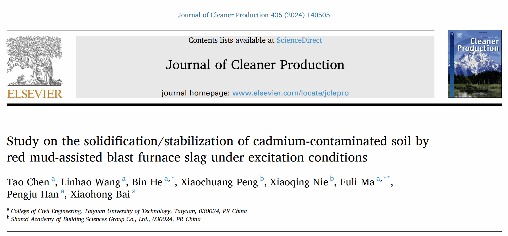 近日,公司2022级学术型硕士研究生陈涛在国际知名期刊《Journal of Cleaner Production》发表了题为《Study on the solidification/stabilization of cadmium-contaminated soil by red mud-assisted blast furnace slag under excitation conditions》的研究论文,导师何斌为通讯作者,bg大游集团官方网站为第一作者单位。