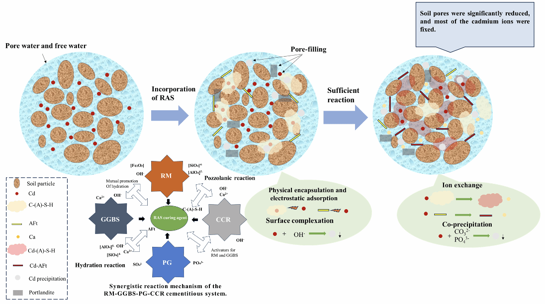 为了实现污染土壤和工业固废的资源化利用,本研究以赤泥(RM)、高炉渣(GGBS)、电石渣(CCR)和磷石膏(PG)为原料合成了一种低碳固化剂(RAS),用于镉(Cd)污染土壤的固化/稳定化(S/S)。研究了镉含量、RAS用量和养护时间对固化/稳定土强度和浸出性能的影响。此外,采用改进的四步提取法(BCR)、压汞法(MIP)、傅里叶红外光谱(FTIR)、X射线衍射(XRD)、扫描电子显微镜(SEM)和能量色散光谱(EDS)揭示了控制RAS固化/稳定化Cd污染土壤的主要机理。结果表明,RAS粘结剂显著提高了Cd污染土壤的抗压强度和Cd化学稳定性,从而降低了Cd浸出量和土壤孔隙度。固化/稳定土的主要产物为镉沉淀物、钙矾石(AFt)和水合硅酸钙(C–S–H)。其含量与初始土壤Cd含量、RAS用量和固化时间有关。Cd沉淀物、C-S-H和AFt产物不仅可以填充土壤的颗粒间空隙,还可以对Cd表现出物理包封、表面络合、共沉淀、静电吸附和离子交换作用。本研究结果不仅为固体废物的处理和利用提供了一种新的途径,还为镉污染土壤的修复提供了一种环境友好、经济、高效的固化剂。