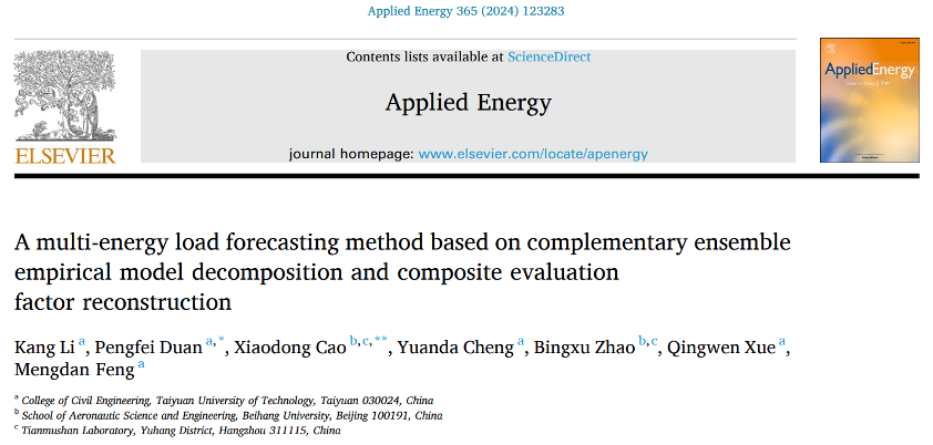 近日,公司2022级硕士研究生李康在国际知名期刊《Applied Energy》发表了题为《A multi-energy load forecasting method based on complementary ensemble empirical model decomposition and composite evaluation factor reconstruction》的研究论文,李康为第一作者、导师段鹏飞为通讯作者,建筑环境控制与可持续能源应用团队程远达、薛庆雯等为共同作者,bg大游集团官方网站为第一作者单位。