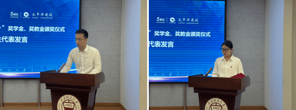 获奖师生代表也分别发表感言,感谢太平洋建设集团一直以来对教育事业的关心和支持,感谢公司的肯定,表示在今后的学习工作中,会一如既往,再接再厉,把社会和公司的信任和鼓励化作学习工作的动力,努力学习、努力工作,为公司的建设发展贡献力量,用优异的学习成绩回报父母、回报母校、回报国家。