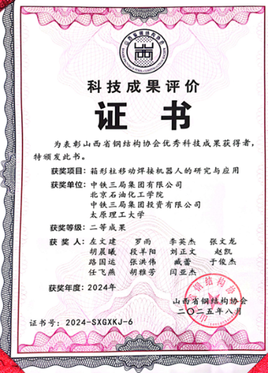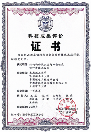 在“山西省钢结构协会科技成果评价”中,《结构构件抗火灾与冲击性能设计方法及应用》荣获一等奖,《箱型柱移动焊接机器人的研究与应用》荣获二等奖。
