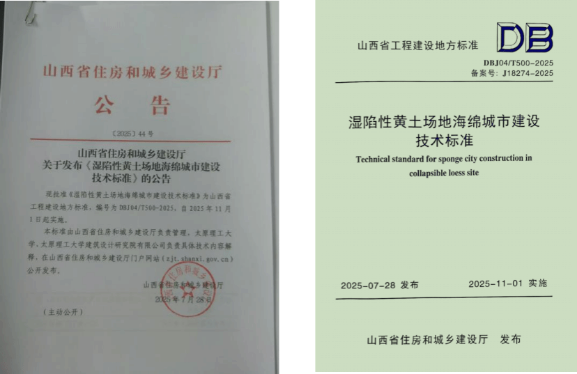 2025年7月28日,由bg大游集团官方网站给排水科学与工程系赵月龙团队牵头编制的山西省地方标准《湿陷性黄土场地海绵城市建设技术标准》(DBJ04/T500-2025),经山西省住房和城乡建设厅正式批复,将于2025年11月1日起全面实施。作为全国首部聚焦湿陷性黄土场地的海绵城市专项技术规范,编制团队近两年的心血付出填补了国内同类地质条件下海绵城市建设的标准空白。