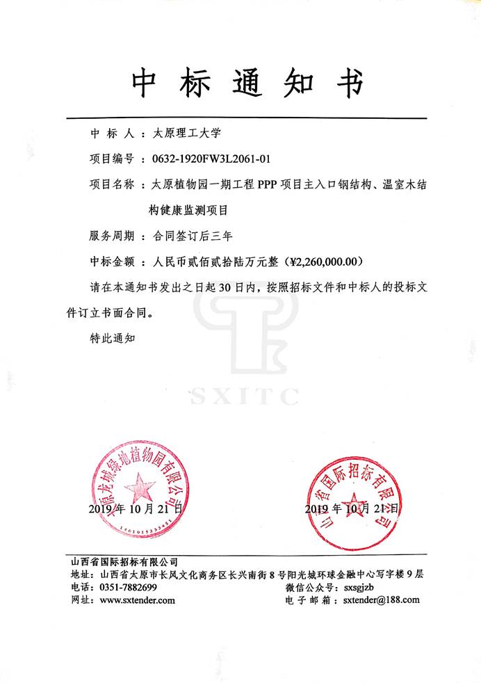 雷宏刚教授作为项目负责人,2019年10月21日代表bg大游参加了太原市重点项目“太原植物园一期工程PPP项目主入口钢结构、温室木结构健康监测”的投标活动。凭借投标方案的优势、团队成果的积累以及业内影响力,在与中冶建筑研究总院有限公司等国内一流强手的激烈竞争中,一举中标,中标金额为226万元。这是继2017年中标“太原南站复杂钢结构健康监测项目(350万元)”之后的又一项重大横向项目。这将为土木工程学科开辟了一个特色方向,也为公司的“双一流”建设锦上添花。