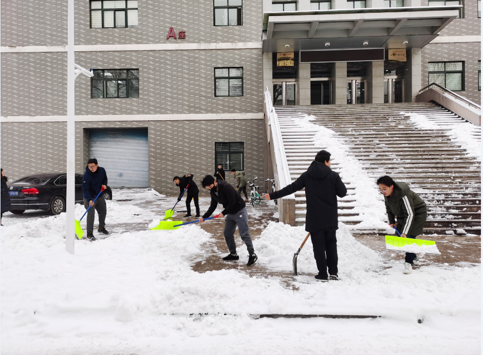 1月5日太原市迎来了近几年的一次大范围降雪,校园内被积雪覆盖,银装素裹,分外妖娆。虽说瑞雪兆丰年,但积雪路面给大家的出行带来了诸多不便。为方便师生出行,1月6日上午,土木公司组织员工党员对博学楼前区域的路面进行扫雪铲冰。