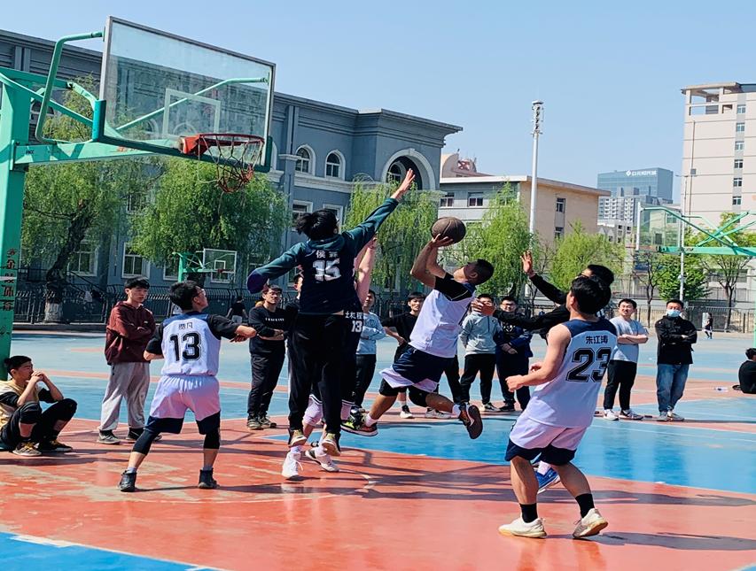 奔跑跳跃,气氛热烈。在土木第三研究生党支部和暖通研究生党支部的比赛中,第三支部凭借过硬的综合素质,在前期取得了较大的优势,暖通支部则充分发挥团队协作的特点,一度将比分差距缩小,经过激烈的比拼,第三支部最终胜出。在比赛过程中,两个支部均展现出拼搏进取的精神风貌,交流了球技,磨练了意志,使现场的每一位同学深受振奋。另一场比赛中,土木第二研究生党支部和土木第四研究生党支部之间的较量同样扣人心弦,双方均展现出了势均力敌的攻防水平,内线卡位、外线远投,比赛场面精彩纷呈,篮球的入网声、观众的加油声此起彼伏,将比赛气氛推向高潮。