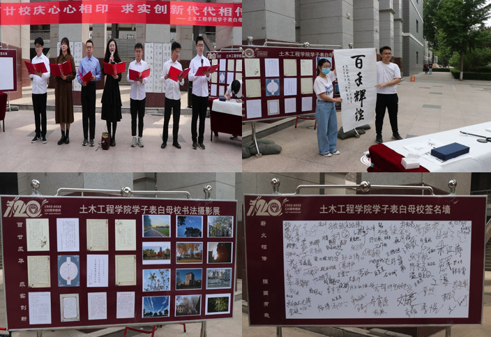 随后,土木学子分别以“年级接龙表白”、“诗歌朗诵表白”、“书法创作表白”、“校歌合唱表白”、“签名留言表白”等方式为母校送上祝福。120年的追求永无止境,沧海桑田,常青的是土木学子乘风破浪的坚定信念,公司本研员工精神饱满,声音洪亮,依次表达对母校的祝福和热爱。配乐诗朗诵《自豪的回响》情感真挚,意气昂扬,流露出土木学子作为太理人的无上荣光。泼墨挥毫迎校庆,笔势酣畅现深情,现场书法创作展现了土木学子对母校发自肺腑的祝愿。“巍巍太行,莽莽吕梁,表里山河是我们华夏的脊梁。”, 嘹亮的校歌合唱,彰显的是土木学子奋发有为的生气,以及对母校发自内心的颂扬。字字真诚,句句动人,醒目的签名留言印证着土木学子对母校的集体告白。至此,表白仪式接近尾声,现场师生在书法摄影展前驻足参观,并集体合影作为留念。