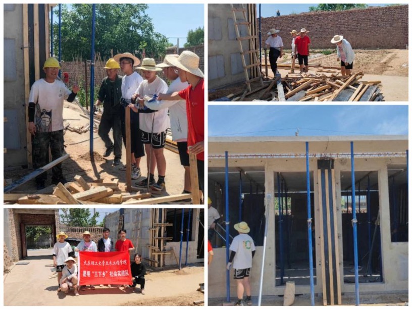 去年10月,冯南垣村遭遇严重洪灾,大量土窑洞被冲毁冲垮,亟待重建,为提高房屋的强度和整体性,灾后重建房屋全部采用装配式建筑。相比于过去的老旧窑洞,装配式建筑具有建造快速,节能环保,质量优良的几大显著特点。6月25日,在建筑工人蒋师傅的指导下,实践队员来到了建筑现场,亲自参与装配式建筑的建造工作,实地学习钢筋绑扎,连接处构造,房屋结构等知识。实践队员们一手戴皮质手套,一手拿卷尺,在满是灰尘的木料堆里寻找适合的建造材料。最终经过队员们的不懈努力,40根1米,20根0.4米长的木梁被成功安装在房屋上。队员们的房屋建造工作完成情况也得到了蒋师傅的高度认可。