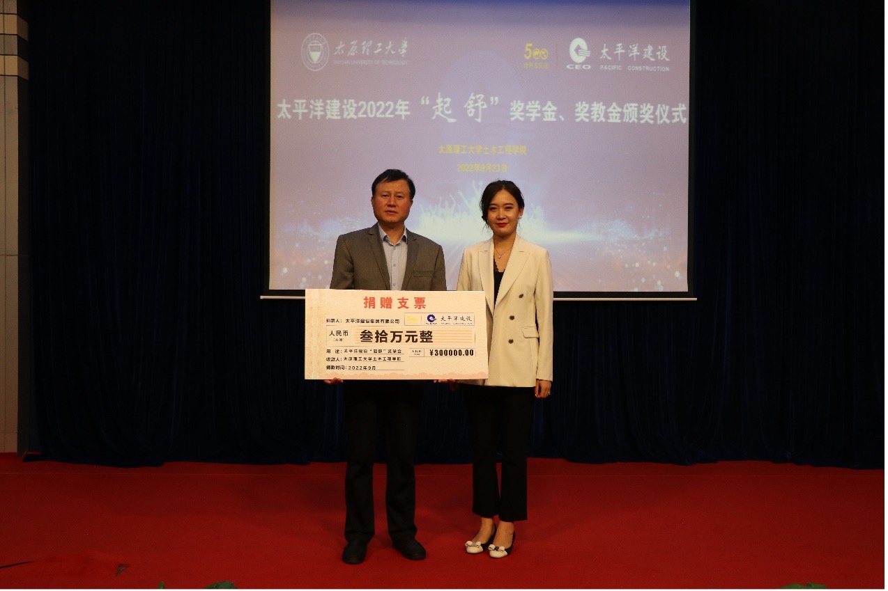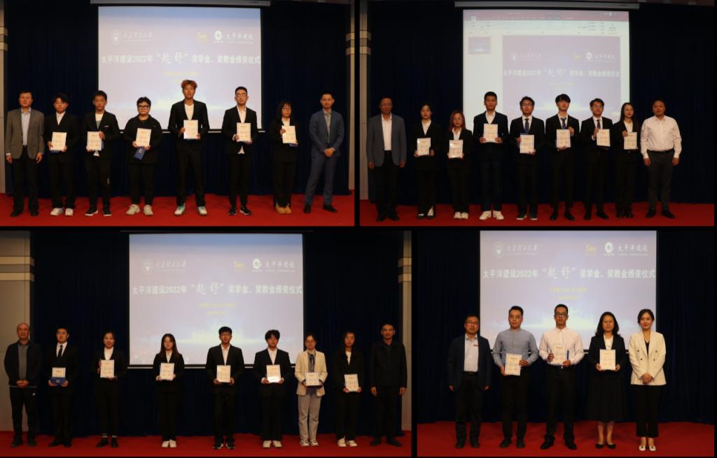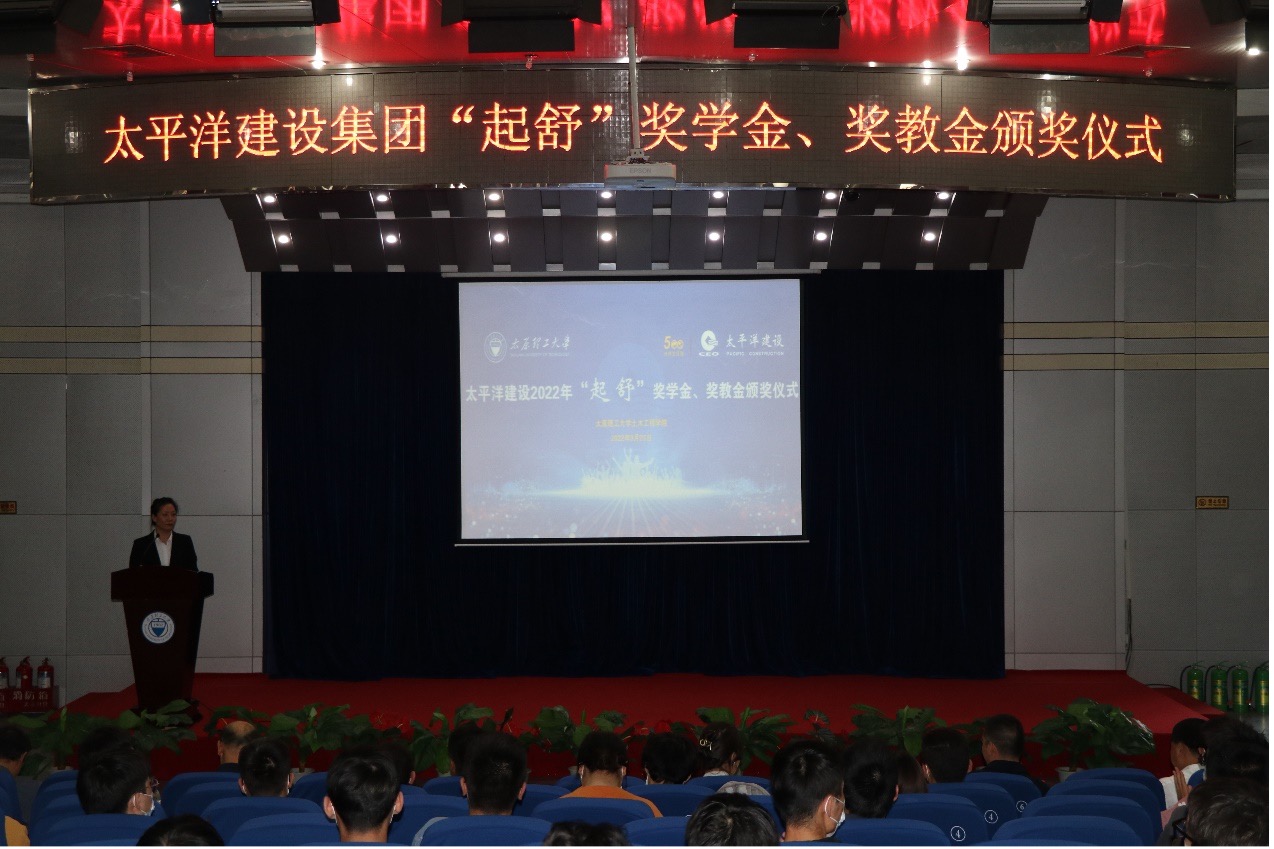 9月23日下午,公司2022年太平洋建设集团“起舒”奖学金、奖教金颁奖仪式于思贤楼报告厅举行。出席颁奖仪式的嘉宾有太平洋建设集团董事局董事、大区总裁、太忻建设董事局主席张艳丽,太平洋建设集团副总裁、未来城市董事、CEO张云山,太平洋建设集团助理总裁、集团人才中心总经理于伟,太平洋建设集团人才中心副总经理陈九伟,校员工处处长赵国俊,校员工就业指导中心副主任高长春,公司党委书记周伟,经理董晓强等企业和公司代表以及奖学金、奖教金获得者。公司各年级本科生代表参会。颁奖仪式由公司党委副书记芦倩主持。