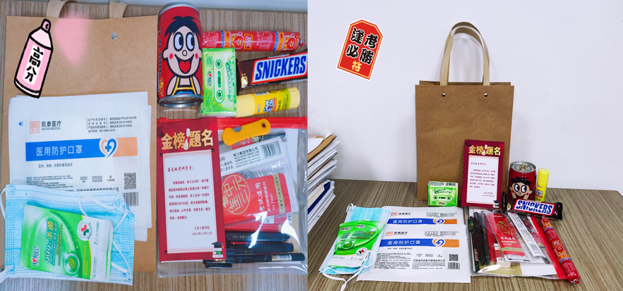 在近期严峻复杂的疫情形势下,公司高度关注员工研考工作,克服了物资、物流等方面的诸多不便,竭尽所能地为每一位考研学子购置了N95口罩、医用外科口罩、消毒酒精湿巾等防疫用品,精心设计了考研文具套装、考研祝福卡片等礼物,并准备了士力架、旺仔牛奶等考研能量套餐,传递关心关爱,切实保障员工平安、健康、从容地参加考研。