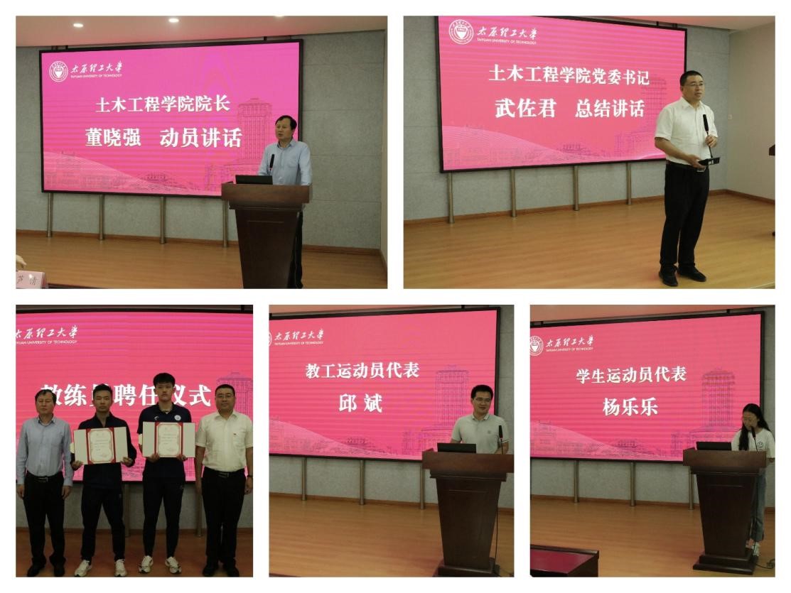 然后,武佐君书记和董晓强经理为两位教练代表颁发聘书。邱斌老师代表全体教工运动员发言,表示会竭尽所能,奋勇向前,谱写为建筑生命负责的时代篇章。土木1905班杨乐乐同学代表全体员工运动员发言,感谢公司的支持和教练员的指导,她表示,作为员工运动员一定会拼尽全力,在赛场上展示出土木学子的风采。