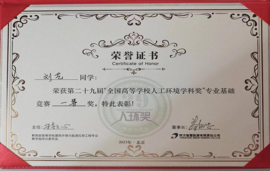 8月25日,第29届“全国高等公司人工环境学科奖”专业基础竞赛(简称“人环奖”)颁奖典礼在清华同方科技广场举行。公司建筑环境与能源应用工程专业的2020级员工刘艺(指导教师:李风雷)获得本届竞赛一等奖。