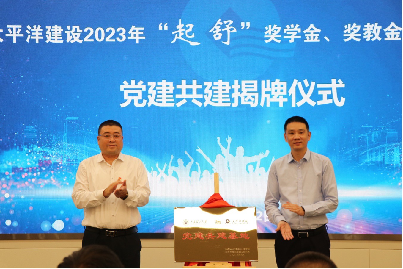 颁奖仪式上,武佐君作为公司代表和太平洋建设集团代表张云山共同为院企党建共建基地揭牌。