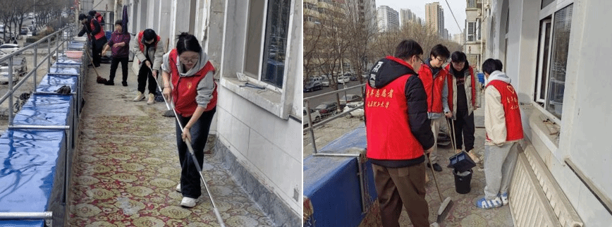 在春风拂面的三月,志愿者们迎着朝霞,身着红色志愿服,怀揣赤诚之心走进养老院。金玉社区养老中心的负责人,护工,老人们对志愿者表示欢迎。一到敬老院,志愿者们立刻进入状态,有条不紊地擦窗户、扫地、拖地、清理垃圾并帮助养老中心清理阳台,方便老人们日后感受温暖的春日。