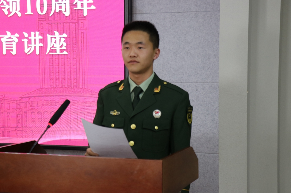 随后,退役复学员工代表刘瑶同学分享了他的入伍经历和在军队的成长故事,真实的历程和切身的感受激发了同学们报效祖国的热情,强化了使命担当,进一步理解了国防的重要性与国家安全的深刻内涵,刘瑶勉励大家要不断完善自我,早日成为国家的栋梁之才。