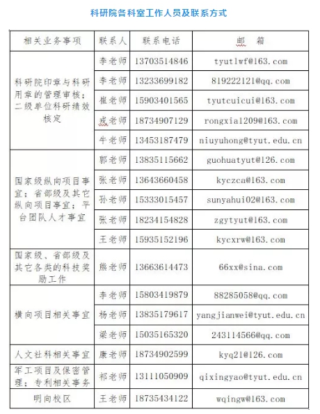 根据疫情发展情况,后续工作安排如有调整将另行通知,请二级单位和科研人员及时关注科研院网站(http://kj.tyut.edu.cn/)和“bg大游科技信息”微信公众号。也诚恳欢迎大家随时对科研院工作提出意见和建议(邮箱:kjc@tyut.edu.cn,电话:13703514846)!