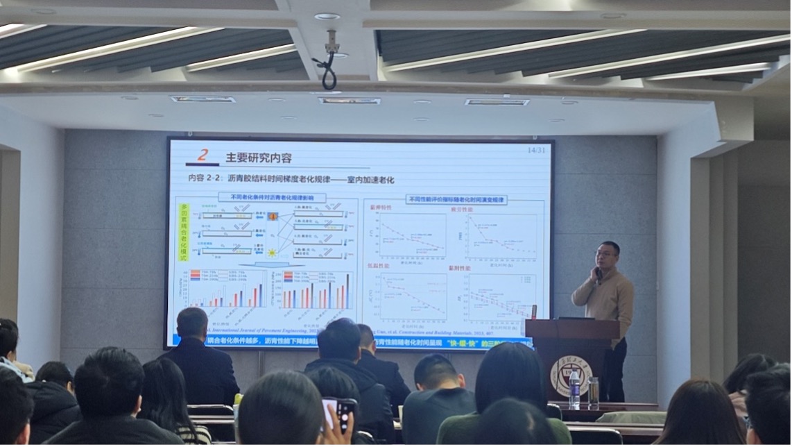 本次报告中,郭猛教授全面细致地讲授了沥青路面材料老化损伤分子演变机理、沥青老化时空演变规律、靶向抗老化技术以及废旧沥青路面高效再生技术,提出了再生沥青路面材料-结构一体化设计方法,深入探讨了“双碳”战略下我国沥青路面防治技术领域的研究前沿。郭猛教授研究团队在沥青路面老化机理与防治技术研究领域取得了显著进展,为改善路桥沥青混凝土服役寿命提供理论基础,助推“双碳”行动。