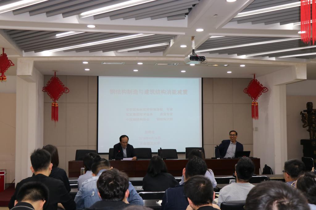 应公司的邀请,贺明玄教授于2018年4月28日到访公司,在博学馆五层会议室做了题为“钢结构制造与建筑结构消能减震”的学术报告,由雷宏刚经理主持,土木系师生100余人聆听了此次报告。