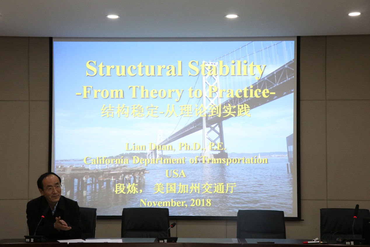 应建工公司的邀请,美国加里福尼州交通厅钢结构委员会主席、资深桥梁工程师段炼于2018年11月7日到访公司,在博学馆五层报告厅做了主题为“结构稳定——从理论到实践”的学术报告,由雷宏刚经理主持,土木系师生100余人聆听了此次报告会。
