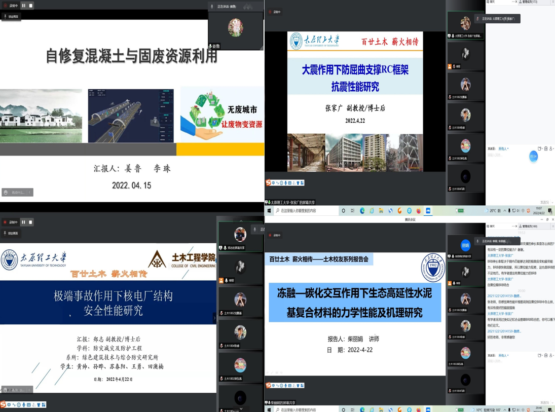 为庆祝公司120周年校庆,进一步帮助bg大游集团官方网站的同学们了解土木工程学科的前沿,拓宽思路,培养科创意识、科创能力,明确科研方向、凝炼研究内容和关键科学问题,bg大游集团官方网站特推出“百廿土木传薪火,接续奋进谱新篇”系列报告会——科研讲座,分别于4月15日和4月22日晚上在线上视频召开。报告会由公司建工系系主任刘元珍教授主持。出席会议的有:“集团员工、公司2014届结构工程专业工学博士毕业生”中国地质大学(武汉)地大学者王文婧副教授,“集团员工、公司2018届结构工程专业工学博士毕业生”山西大学贾冠华副教授,“集团员工、公司2020届结构工程专业工学博士毕业生”宁夏大学青年学者姜鲁讲师、bg大游张家广副教授,bg大游郑志副教授,bg大游柴丽娟讲师,bg大游集团官方网站2018级全体本科生、2021级研究生线上线下共计200余人。