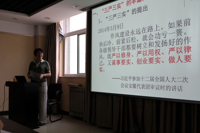白晓红传达了公司党建工作会议精神和公司党委《关于在全校处级以上领导干部中开展“三严三实”专题教育的实施方案》,具体阐述了“三严三实”的丰富内涵,指出了“不严不实”的一些表现和实现“三严三实”的路径。