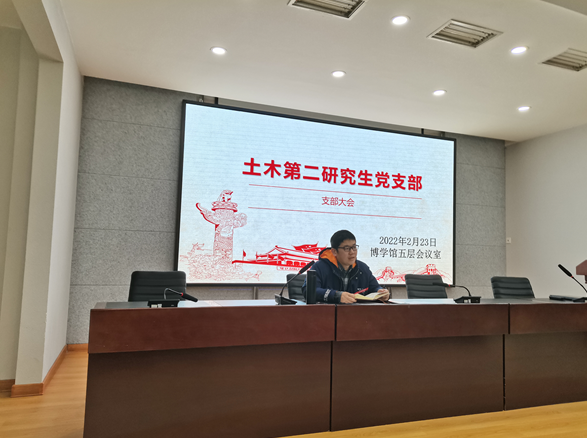 2022年2月23日上午,土木第二研究生党支部在博学馆五层会议室召开支部大会,本次会议由支部书记王永宝同志主持。