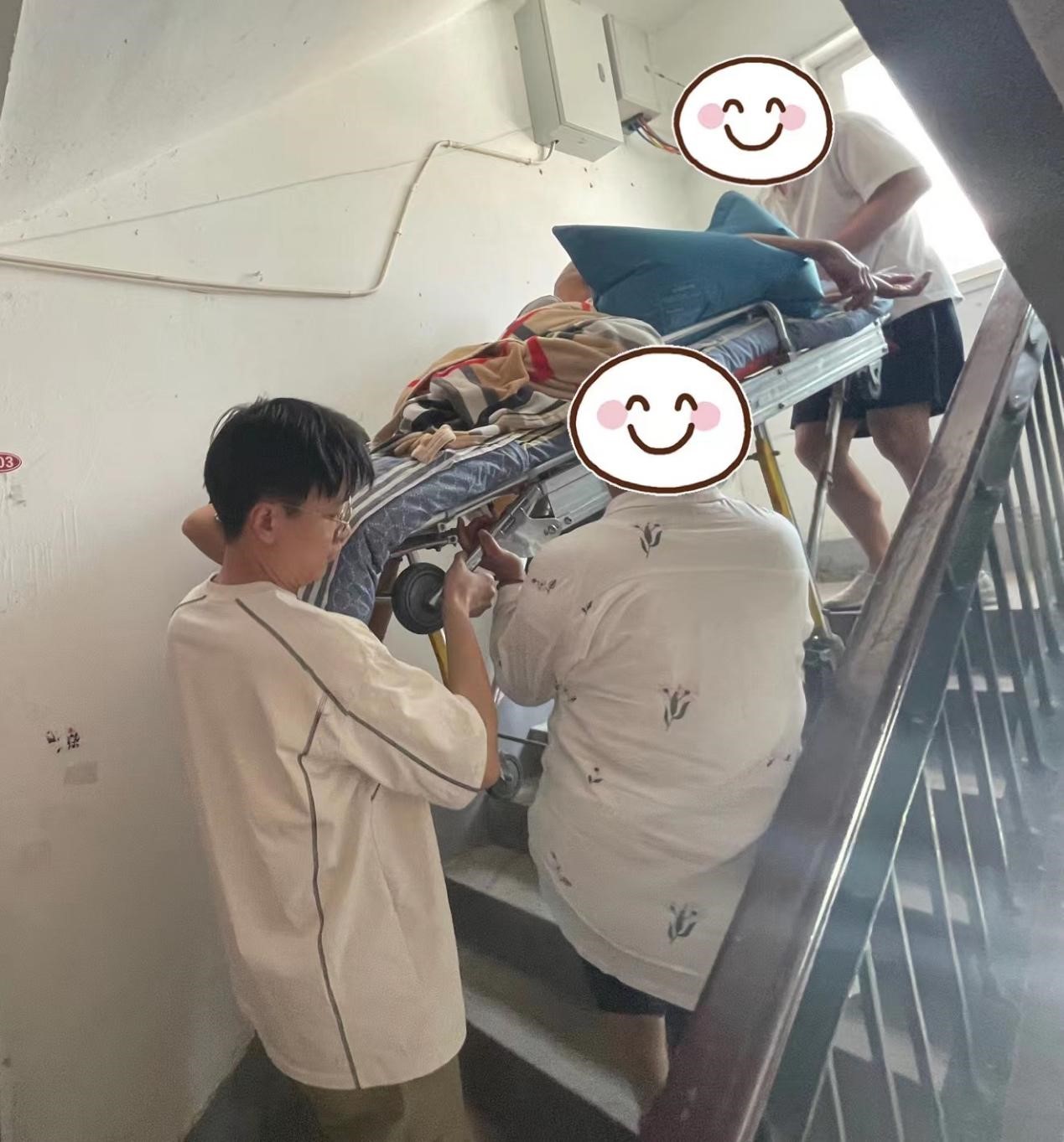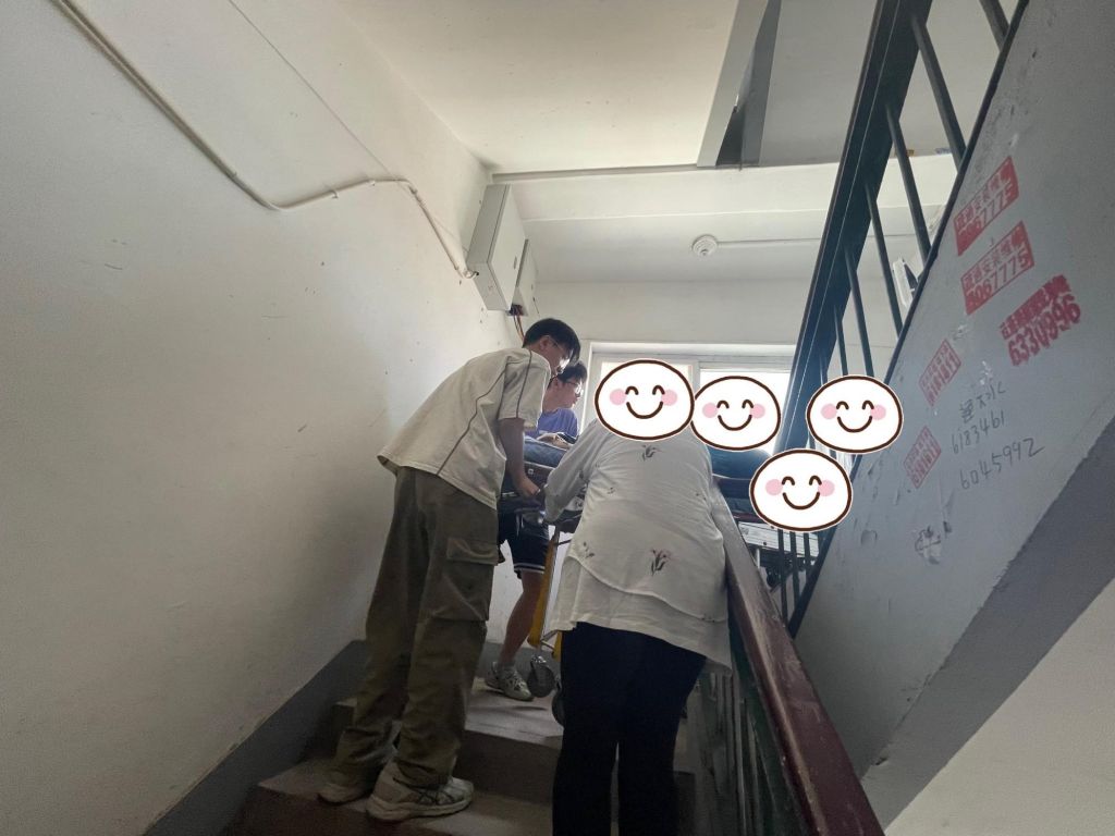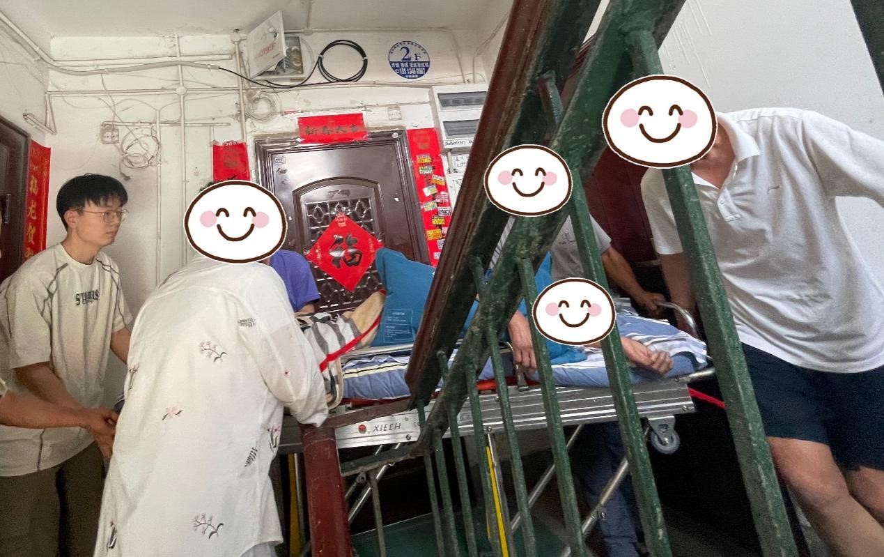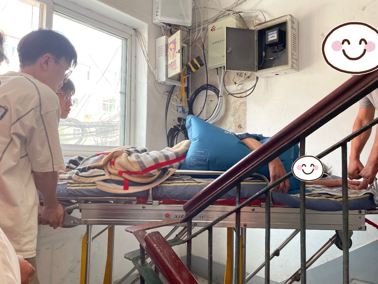 2024年6月13日中午11点半,土木第一研究生党支部书记柳丽接到一名bg大游教职工的求助信息,对方称其居住在bg大游西院住宅小区无电梯的住宅楼4楼,其家属中午12点将从医院治疗出院归来,但由于行动不便依旧卧于担架车上,而其他男性亲友有事无法前来,该名教职工及女性家属将出院家属抬上楼存在困难,所以希望能得到志愿者的帮助。柳丽同志在了解具体情况后,随即号召支部张鹏昆、曹培格、岳中华、张凯4名党员,积极承担抬担架助群众回家的“伸出援手,照亮他人”志愿服务,大家没来得及吃午饭便前往bg大游西院住宅小区进行帮忙。