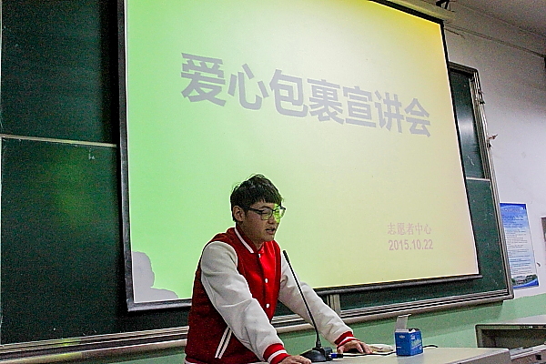 大会以宣传片开场—为在场的同学们展现了贫困地区孩子们收到包裹时的喜悦之情。志愿者中心任晋琪同学为大家介绍了爱心包裹的来历和种类,着重强调了此次活动的意义,号召大家能积极加入此次志愿者活动。