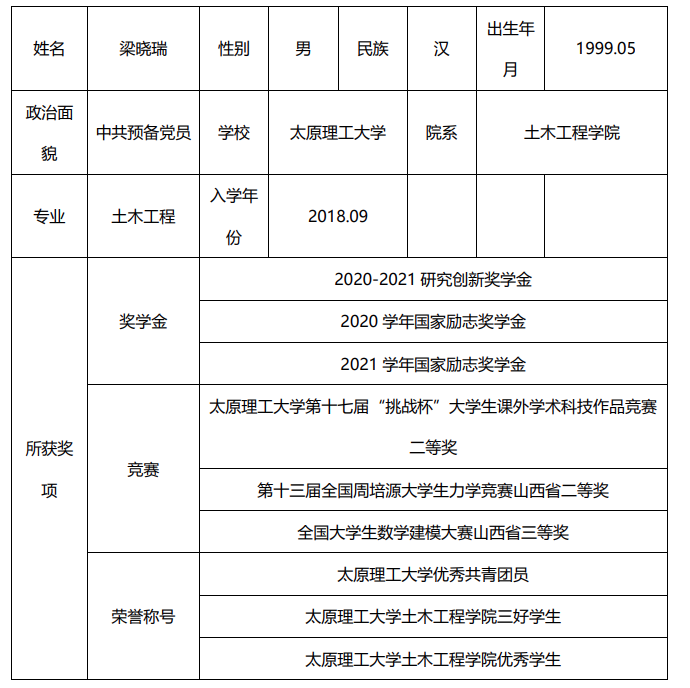 学习是我进入大学的本职工作,大学里的每一堂课,都会坐在第一排认真听讲,做随堂笔记。把每一门课在大脑里归纳为思维导图,优化自己的专业知识结构,培养自己全方位的思考能力。始终把学习成绩放在首位,也让自己的平均成绩保持在85分以上。在bg大游校训“求实、创新”的鞭策下,在学习专业基础知识的同时,怀着对专业技能的实践和创新的渴望。很荣幸,2019年我参与了一项国家级老员工创新创业训练项目,开始了对科研的实践和学习;一起同研究生学姐、博士学长学习各类科研软件、学习实验操作。在整个大创过程中,从最开始的懵懂无知,到查阅文献深入了解项目,再到试验操作、数据处理,到最后的论文撰写,专利撰写。在此期间,我收获很多,从中汲取到很多知识,也使自己的实践、科研、汇报能力不断提升,非常感谢指导老师的认真负责,大创项目历经一年半,经过团队的不懈努力,取得了一定的研究成果。先后发表一篇中文核心期刊论文,两项国家级专利已进入实质审查阶段。同时,我利用自己的课余时间,参加了“高教杯”全国数学建模比赛获得山西省三等奖,且发表一篇数学建模方向普通期刊论文,依靠老员工创新创业项目参加bg大游第十七届“挑战杯”老员工课外学术科技作品竞赛获得二等奖、参加第十三届全国周培源老员工力学竞赛获得山西省二等奖。通过国家四六级考试,利用假期,先后在山西五建、太原城建、山西建工单位实习,将专业理论知识和实践相结合,深化自己的专业知识。