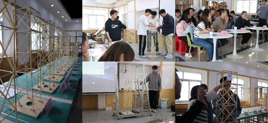 现场测试环节中,参赛队伍按照抽签顺序依次上台展示,在保障结构稳定性以及安全性的前提下满足轻量化目标是选手最大的挑战,选手们运用扎实的专业知识、敏捷的空间思维和扎实的制作工艺带来了许多优秀的作品。评委老师们针对模型的制作质量和结构体系都做出评价,也给出了合理的改进意见。经过对各参赛组理论方案的审议和现场测试环节的综合评定,最终评选出一等奖4组,二等奖5组,三等奖6组,创意奖、制作奖、鼓励奖等单项奖各一组。