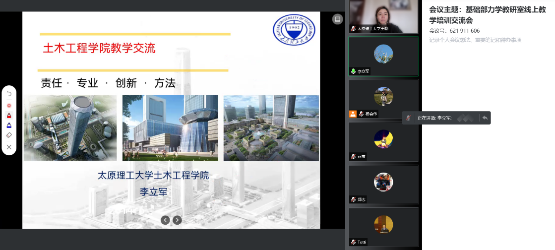为切实做好疫情防控期间教学工作,基础部力学教研室于2022年4月15日举行线上教学培训与研讨专题会。会议由土木公司基础部主任、山西省一流课程《结构力学》负责人王蕊教授主持,邀请土木公司建筑工程系李立军老师进行经验分享和教学指导,结构力学课程团队全体老师参加了本次会议。