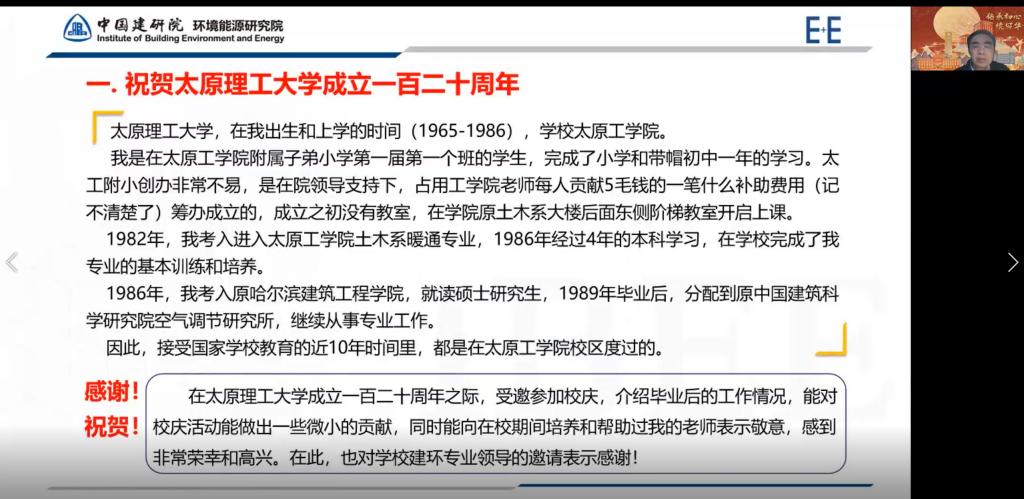 在学术交流报告结束后,会务组还邀请了不同地区各个岗位的20多位暖通员工代表们发言致辞。员工代表们包括了79级员工、暖通系退休老教师代表王飞教授,88级员工、太原市热力设计院有限公司总经理梁鹂教授级高工,88级员工、中核第七设计院有限公司建筑工程设计院经理李侃教授级高工,95级员工、山西大地环境资源有限公司总经理赵文强,20级员工、北京华清荣昊新能源开发有限公司副总经理武雪峰,09级员工、西南交通大学特聘副教授余敏,11级员工、中国人民解放军某部少校副队长郝秀渊,12级员工、加拿大康卡地亚大学零能耗建筑研究中心李经博士,14级员工、山西省建筑科学研究院绿建所所长张马斌等,他们分别通过视频连线的方式回顾了校园生活的美好记忆,表达了对母校、对老师们的感激之情,并送上了对母校120周年校庆的深深祝福。部分因为工作原因不能连线的员工们也纷纷通过微信传递了对母校的诚挚祝愿。