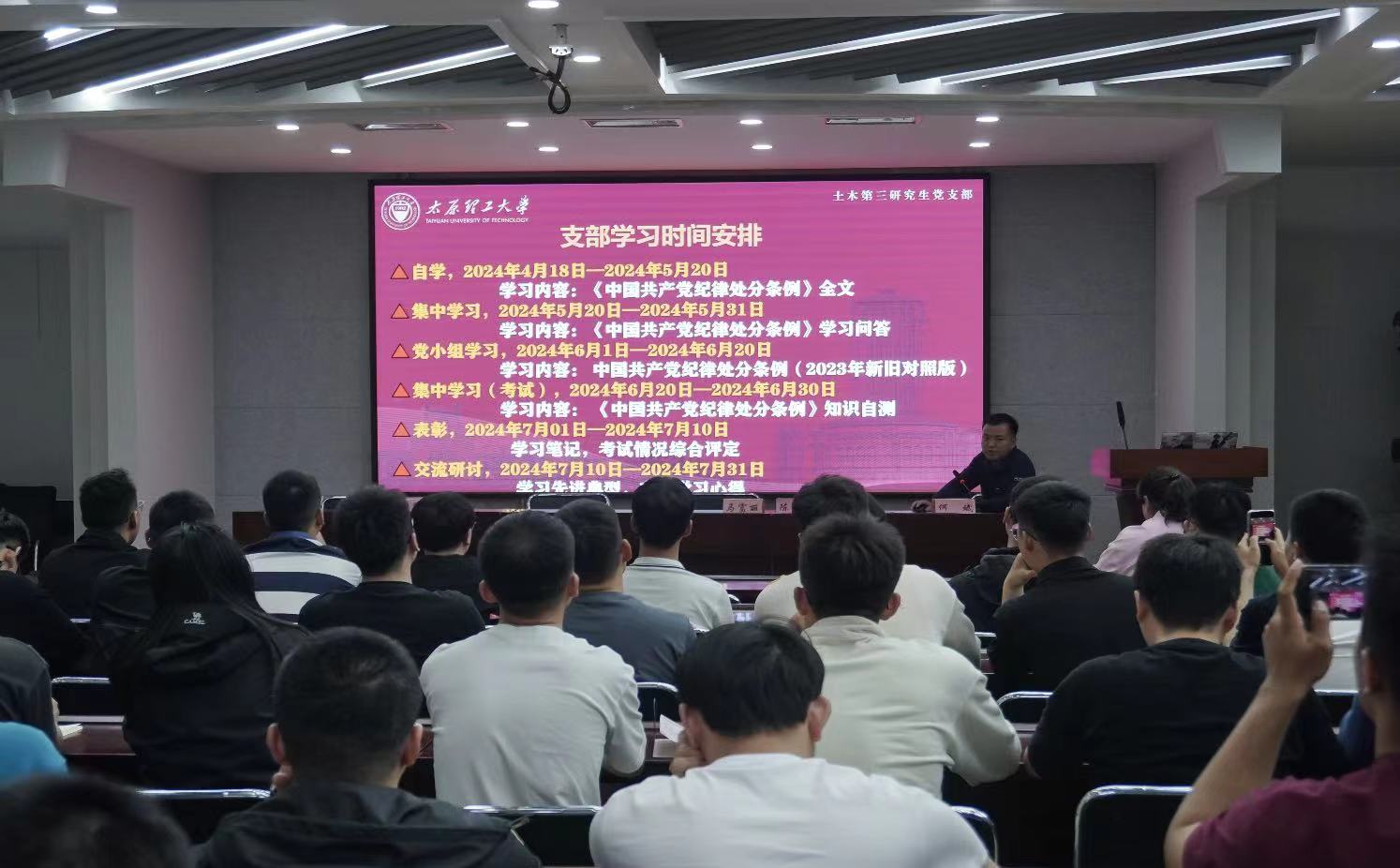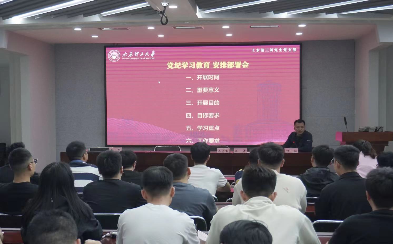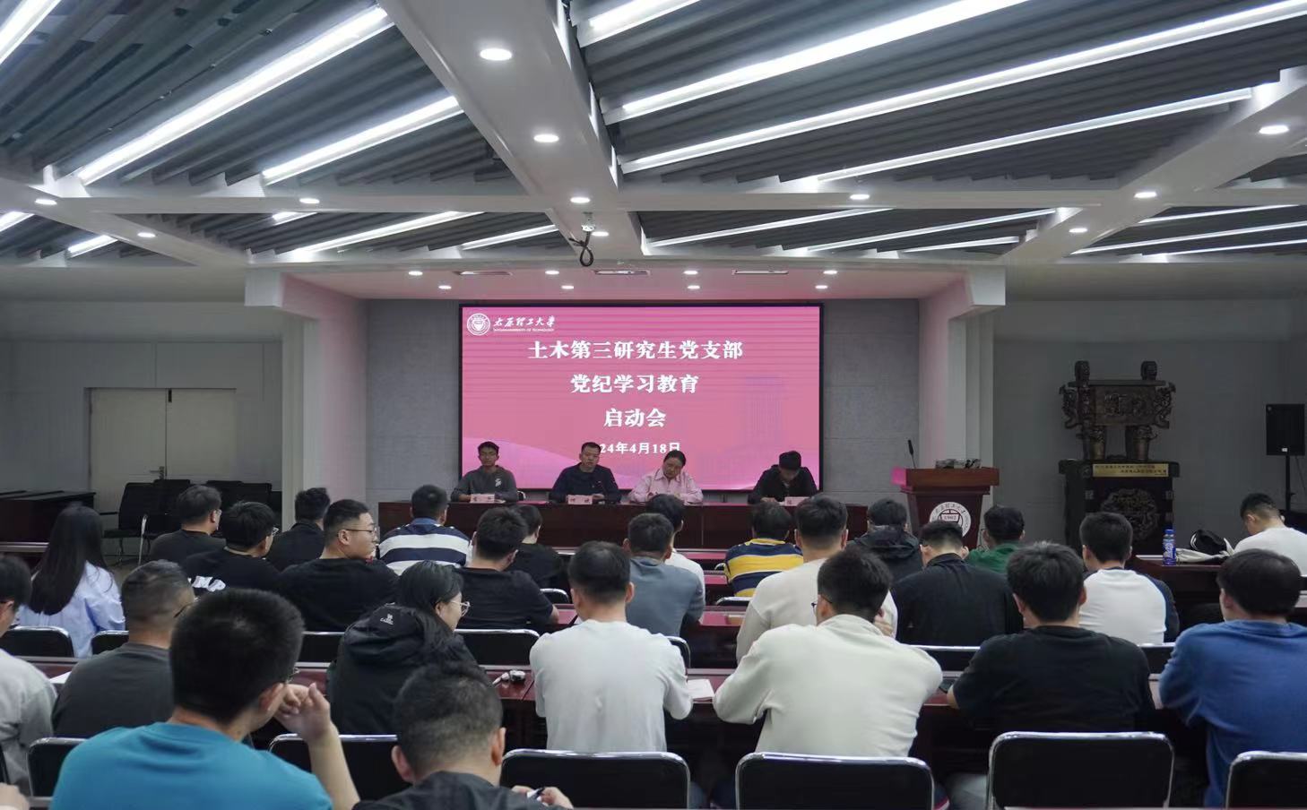 4月18日下午,土木第三研究生党支部在五层会议室召开党员大会,传达学习4月15日上午公司党委常委会(扩大)会议要求和4月15日下午公司党政联席会关于党纪学习教育工作的安排,启动支部党纪学习教育工作,并对学习时间、内容等进行了具体安排。全体党员参加,会议由支部书记何斌主持。