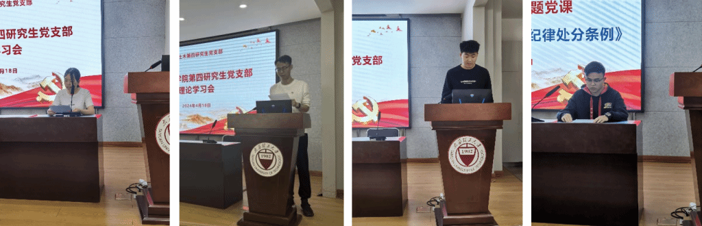 组织委员李赟、宣传委员王浩宇、第一党小组组长兰曈、第二党小组组长闫鑫伟分别领学了“习近平总书记在湖南第一师范公司考察时的重要讲话精神”、“《时刻保持解决大党独有难题的清醒和坚定,把党的伟大自我革命进行到底》”、“《必须坚持人民至上》”和“《中国共产党党员网络行为规定》”。支部书记邱斌以专题党课的形式传达了关于党纪学习教育的文件精神和工作要求,并带领支部全体党员同志深入学习贯彻《中国共产党纪律处分条例》。他指出,党纪学习教育是以习近平同志为核心的党中央作出的重大决策部署,是加强党的纪律建设、推动全面从严治党向纵深发展的重要举措。全体党员同学要深刻认识此次党纪学习教育的重大意义,通过学习教育弄清楚党纪的要求,明白违反的代价,有针对性地剖析反思,解决自身存在问题,切实提升自律能力,树立正确的世界观、人生观和价值观。