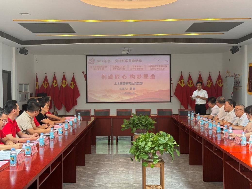 土木第四研究生党支部书记邱斌围绕“钢魂匠心,构梦堡垒”的党建主题做了工作汇报,针对支部基本情况、支部组织建设、支部党建研究项目、党建品牌以及支部取得的党建工作成果向参会人员进行了详细介绍,展示了支部在社会实践、科研创新方面取得优秀成绩,并同与会代表围绕深化党建共建、人才培养社会实践等方面进行交流,对未来的共同发展提出了规划和目标。