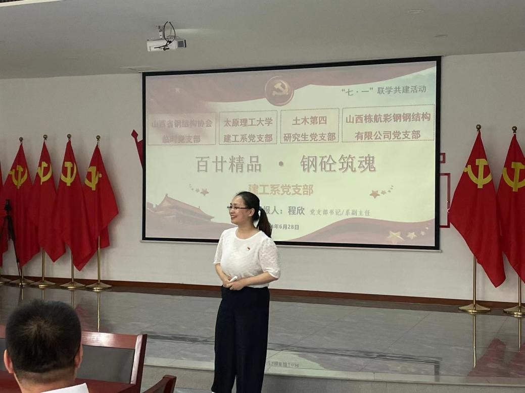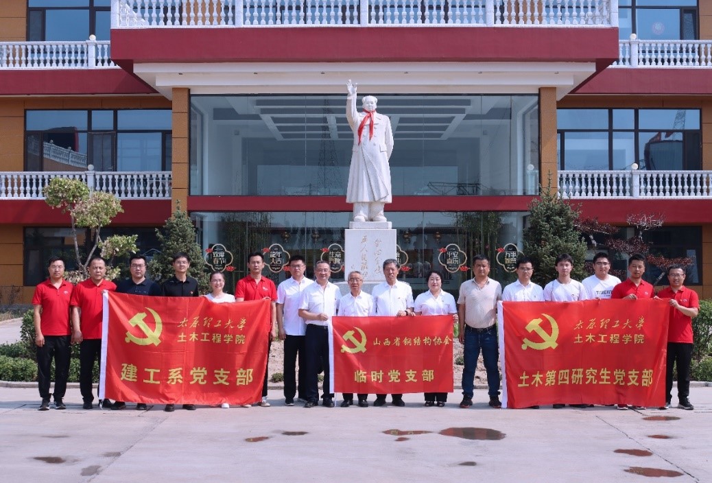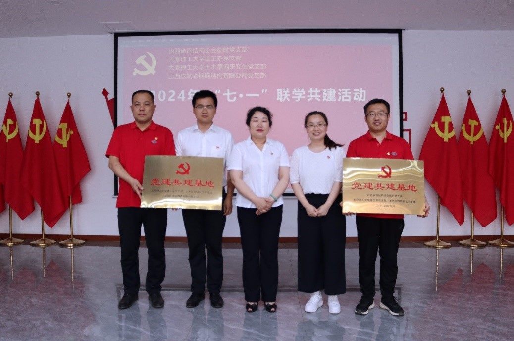 为庆祝中国共产党成立103周年,进一步深入学习贯彻落实习近平新时代中国特色社会主义思想及党的二十大精神,全面推进基层党组织建设,积极探索“党建+业务”深度融合模式,构建“党建引领、校企合作、发展共赢”的党建新格局。2024年6月28日上午,bg大游建工系党支部联同土木第四研究生党支部、山西省钢结构协会临时党支部和山西栋航彩钢钢结构有限公司,共同举办了七一党建共建活动,并举行了党建共建基地的揭牌仪式。参加此次活动的主要人员有:山西省钢结构协会临时党支部书记沈沛鸿、会长李海旺、秘书长兼支部副书记石彦卿、常务副会长张波、副秘书长李卫文,bg大游建工系党支部书记程欣、副书记孟宪杰、党小组组长刘瀚超,土木第四研究生党支部书记邱斌及山西栋航彩钢钢结构有限公司董事长王国栋、总经理闫峰、总工程师朱学强、业务总监霍永结、生产总监王飞、财务总监曹彩庆、党支部书记张继良等。
